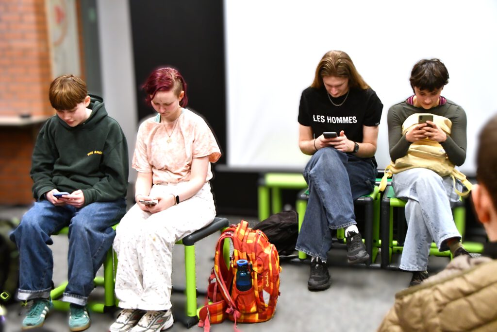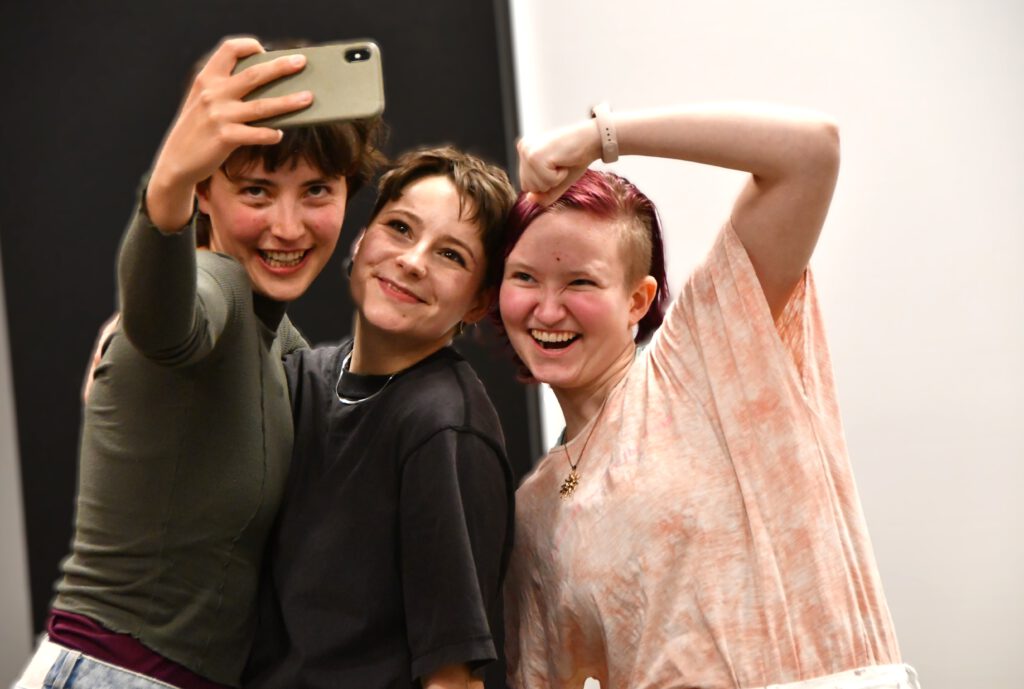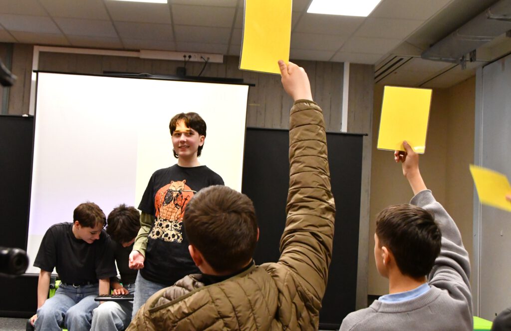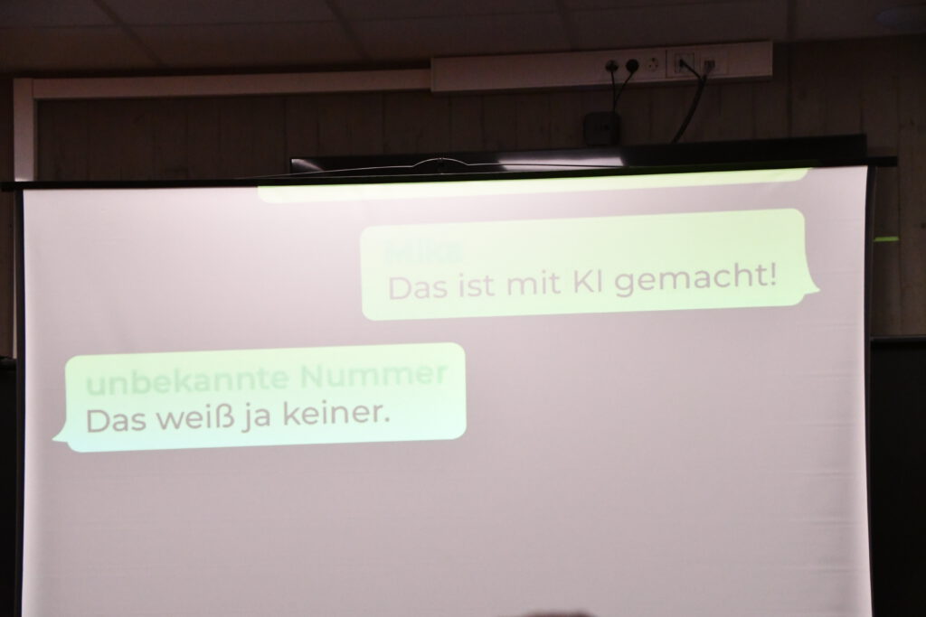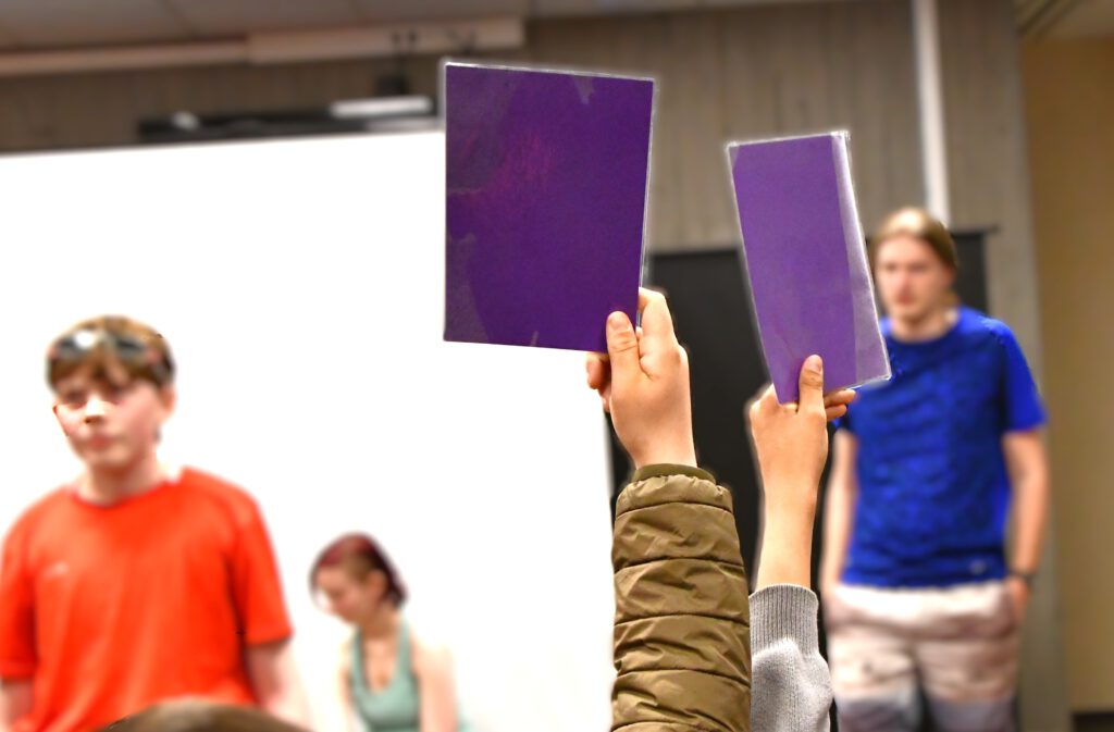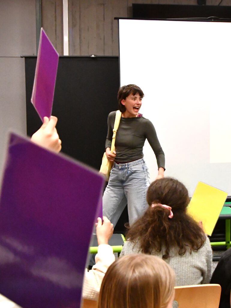 „My Space – Jetzt!“ sensibilisiert für Risiken digitaler Kommunikation, insbesondere für die Gefahren von Deep Fakes. Die Schüler*innen im Publikum werden aktiv eingebunden: Mit gelben und lila Karten stimmen sie an entscheidenden Stellen über den Verlauf der Handlung ab. Jede Abstimmung eröffnet zwei mögliche Entwicklungen und macht die Konsequenzen von Entscheidungen unmittelbar erlebbar.